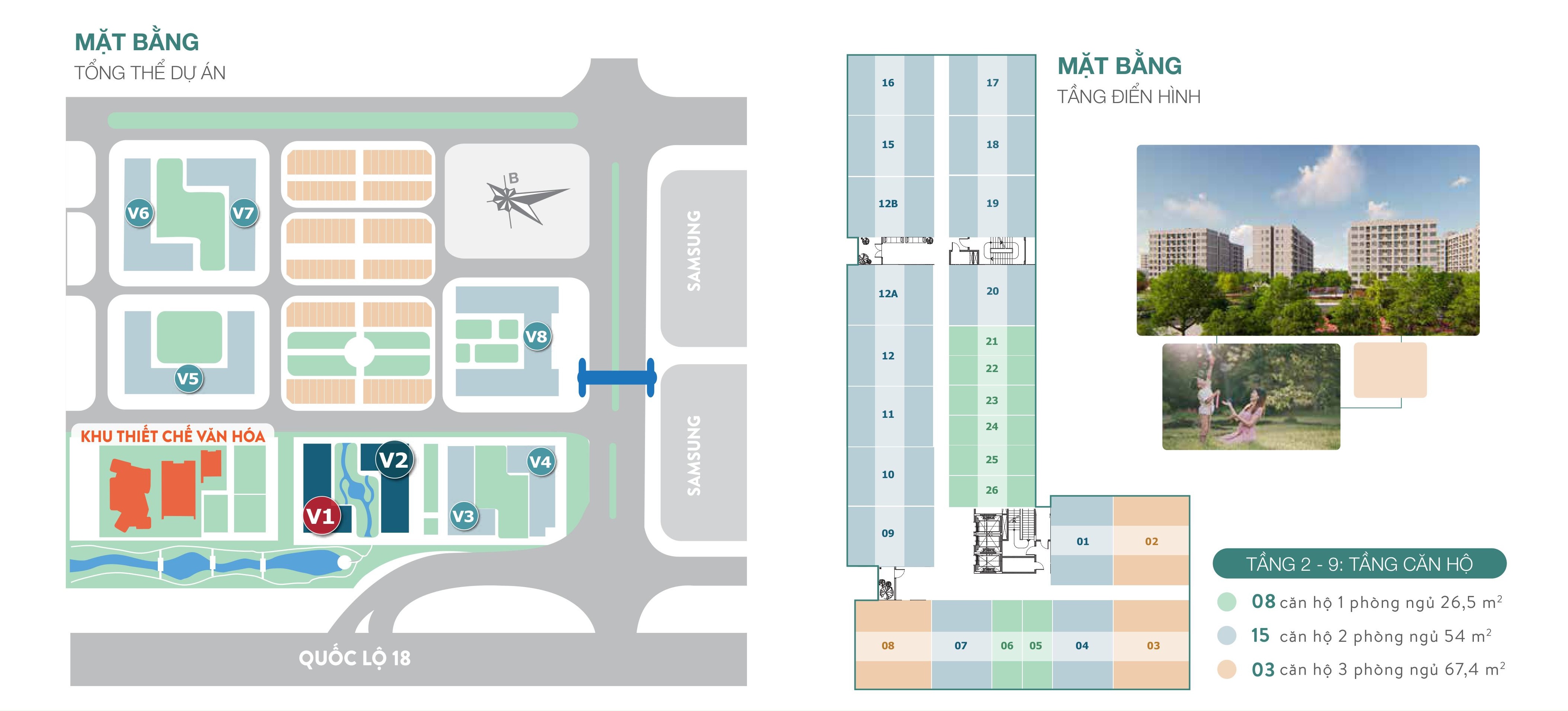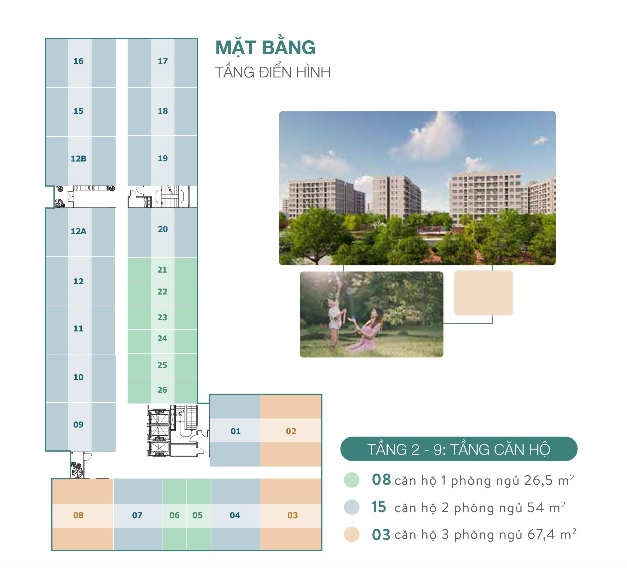 Diện tích: 26,5 m² - 54 m² - 67,4 m² (từ 1 - 3 phòng ngủ)